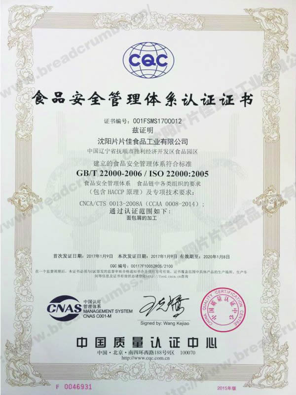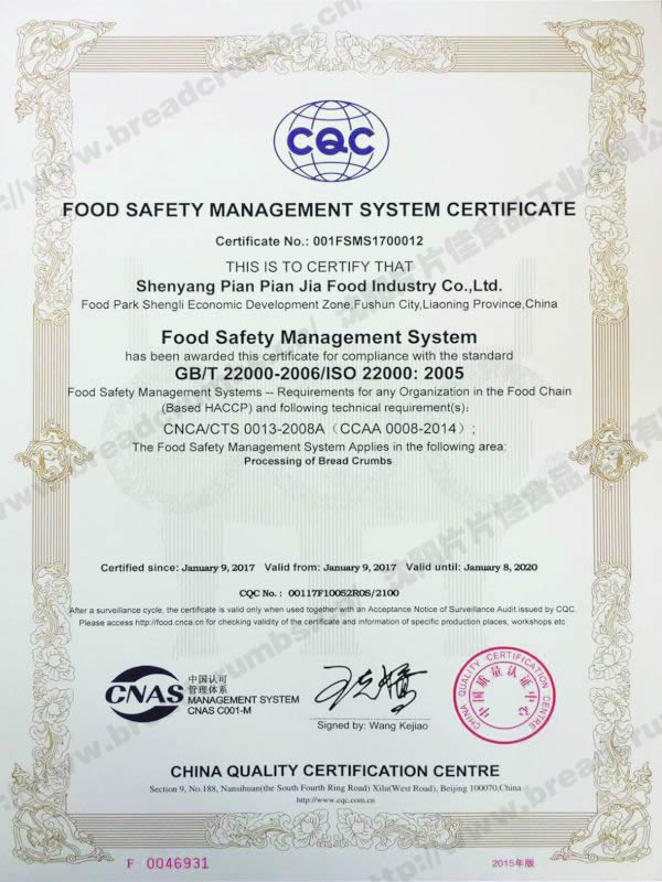 食品安全管理體系認(rèn)證證書-中文