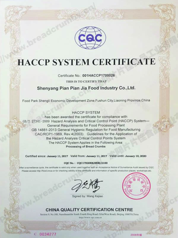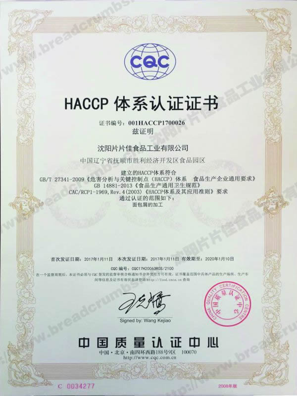 HACCP體系認(rèn)證證書-中文